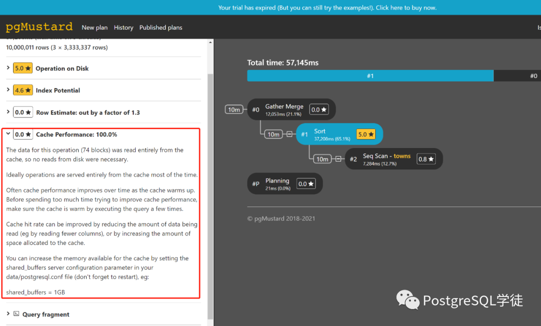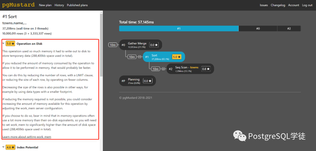 核心还要学会SQL的等价改写,但是这需要经历一个漫长的经验累积的过程,以我目前的功力还远远达不到去对SQL等价改写这个复杂的技术栈去评头论足,不过既然高级一点的不会,那我们就旁路,迂回战术,使用一些现有的工具,如pgMustard — review Postgres query plans quickly,pganalyze自动化性能诊断和优化产品等,助力我们优化SQL,达到事半功倍的效果。