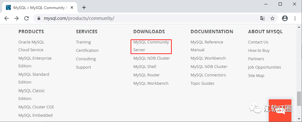 滑到网页底部,点击 DOWNLOADS 列表下的 MySQL Community Server,如图 2 所示。