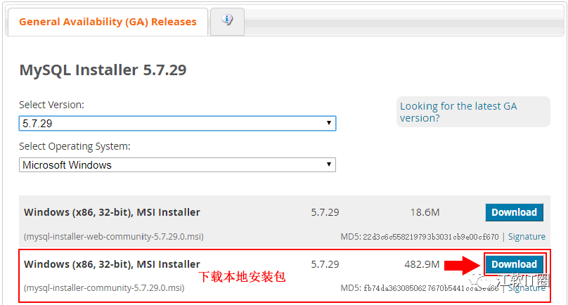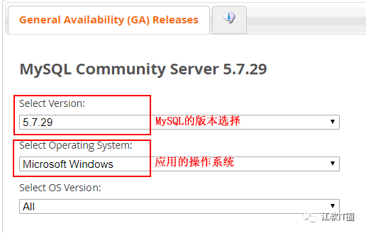 在下载页面中,选择 MySQL 的版本和操作系统,这里操作系统选择 Microsoft Windows,如图 3 所示。