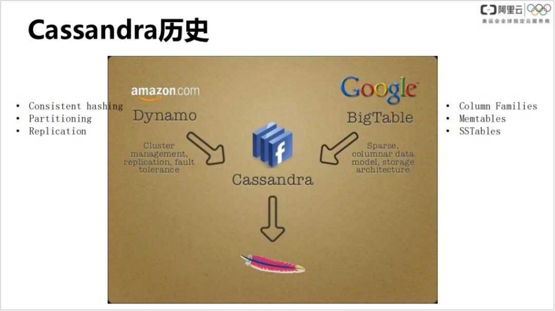 Cassandra 起源于早期非常著名的两个 table:google 的 BigTable 和 Amazon 的 Dynamo。Cassandra 从 BigTable 里面吸取了 LSM 单机引擎的精华,包括 Column Families、Memtables 和 SSTables;又从 Amazon 07年推出的 Dynamo Tabel 学习了怎么做分布式、怎么管理集群和灾难容错等经验。关于单机实现,Dynamo table 并没有披露太多,只提到一点 B-tree,基于此推测大概率是基于 sql 的 InnoDB 引擎。
