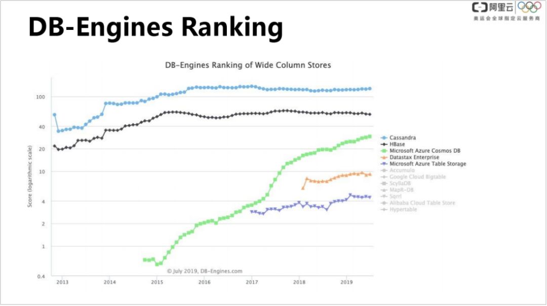 DB-Engines 的数据库排名在宽表领域对比了 Cassandra、Hbase、Microsoft Azure Cosmos DB 等比较著名的数据库,可以看到从13年 Cassandra 发布了2.0版本到现在,Cassandra 的表现都是一马当先的,热度远高于 HBbase 的。Cassandra 的热度在100以上,HBbase 大概只有50左右。