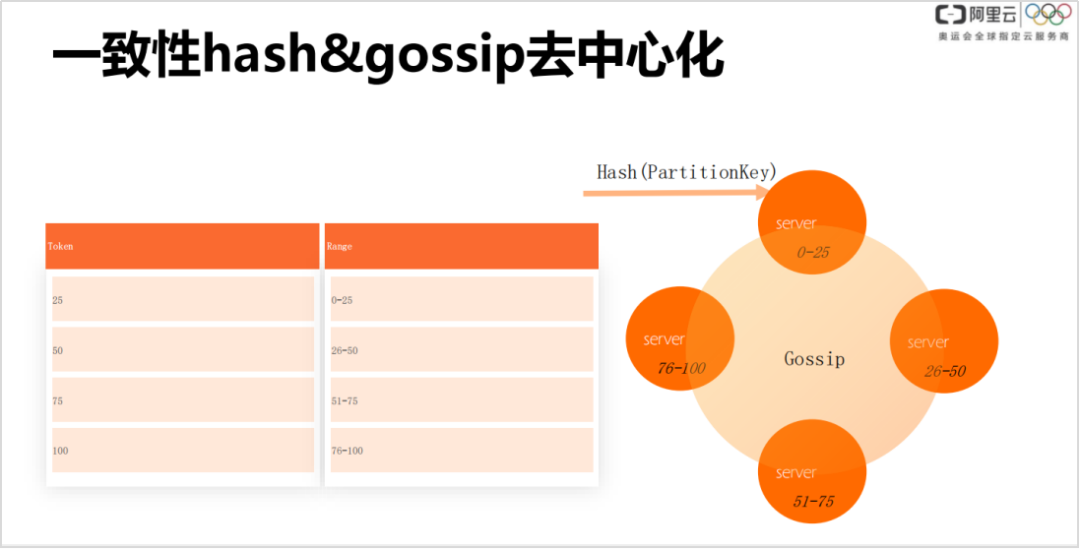 大体思路是:gossip 上带有程序,可以取个 hash 整数,后端进行 server 其实也会有唯一节点,把唯一节点做成 id 排序,每个 server 会管理一个 range。所以对于一个主键在 Cassandra 里是会切出前半部分,算出 hash 值之后,在这个环里可以做映射。
