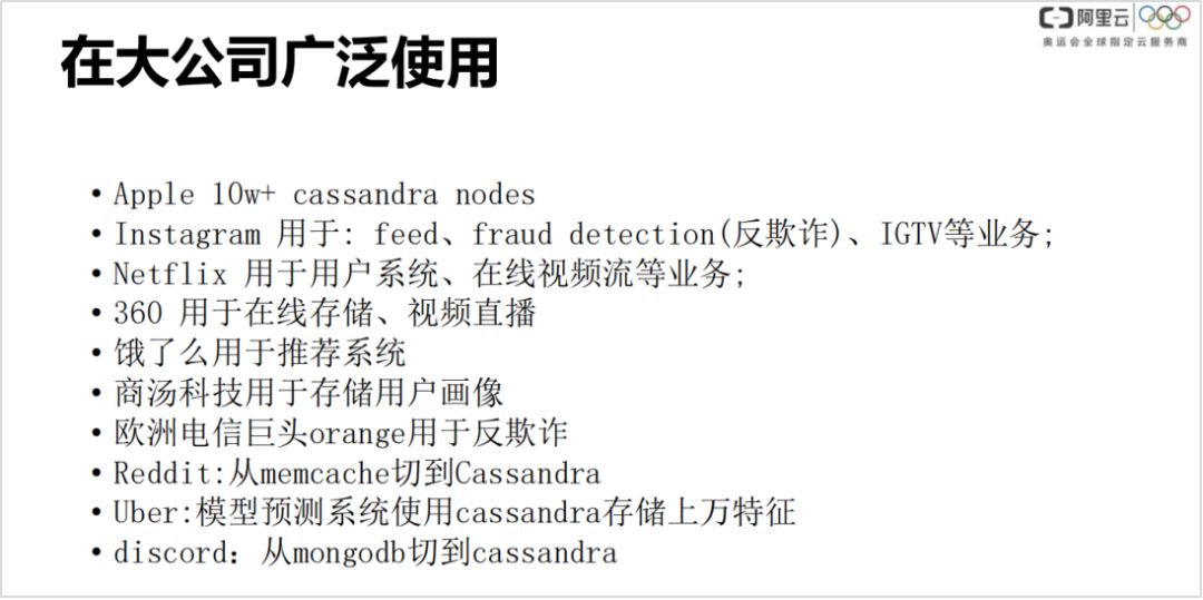 Cassandra 在各大公司都有广泛使用,这里列举了国内外一些大型公司的使用情况。Apple 有大范围使用 Cassandra,对外披露有 10W + nodes。国内360有使用,饿了么在推荐系统中也有使用。还有国外的一些巨头,像 Reddit 论坛平台和 discord 点餐平台也有在使用,比如 memcache 切到 Cassandra 主要是受限于内存。