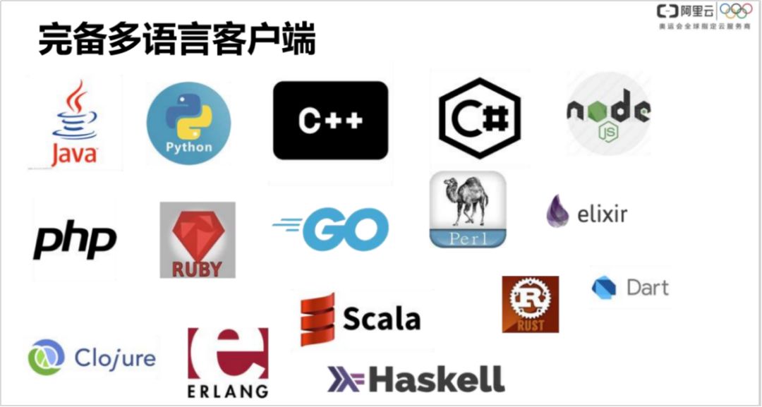 有非常完备的多语言客户端,主流的语言都在里面,包括我们常用的 python、C++、Go、node JS、php 等日常使用比较多的语言。