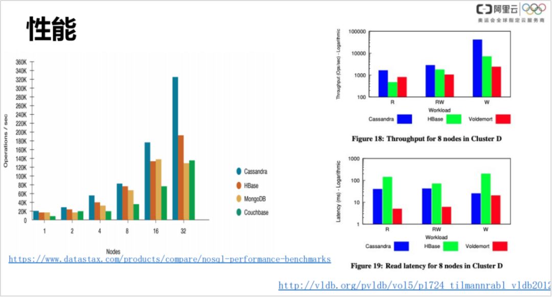 这是外部的一些权威的性能披露。左侧图对比了 Cassandra、HBase、MongoDB 和 Conchbase 的性能表现,右侧是比较有名的一篇论文,对比了 Cassandra、HBase 和 Voldemort 在延时、吞吐化方面的表现,Cassandra 的延时表现是优于 HBase 的。