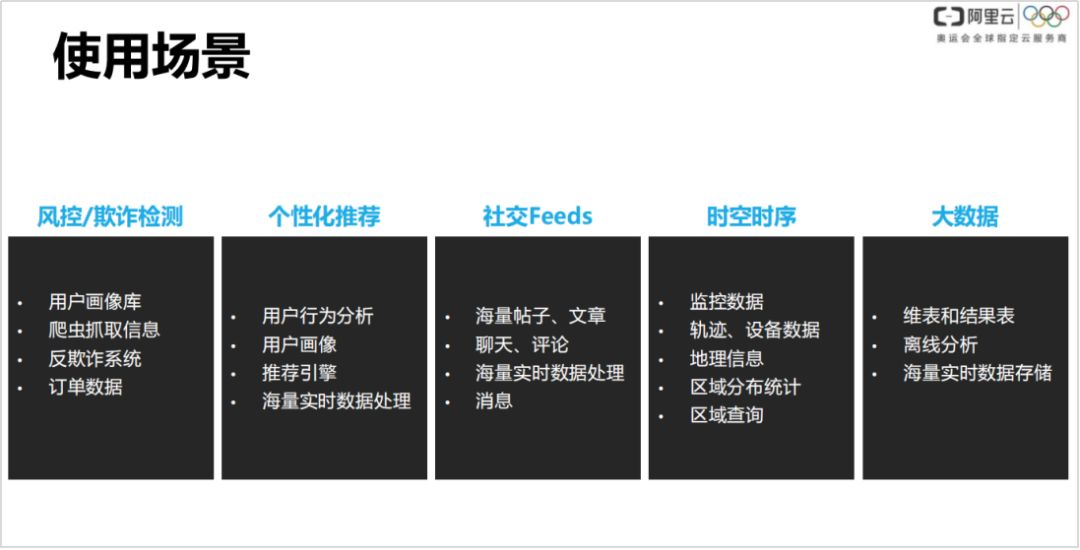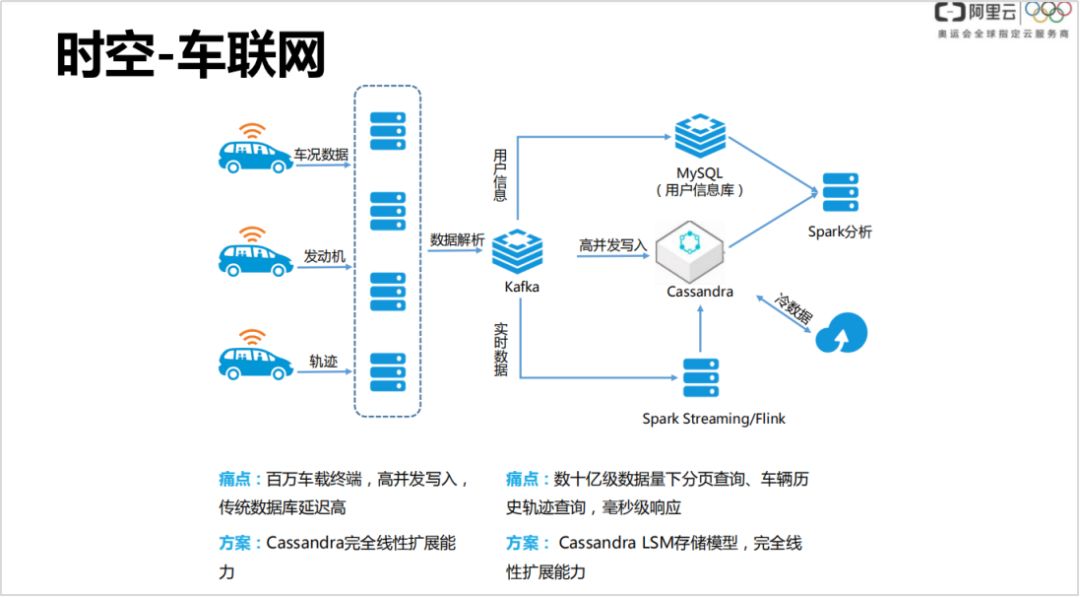 现阶段 IOT ( 物联网 ) 是比较热门的,有各种可穿戴设备,比如手表电话之类,还有像滴滴这样的公司,都会把数据实时上传到在线的数据库里。一般可能会做一些初期的 ETL 转换,在这个例子中使用 kafka、消息队列,然后有可能发的是比较快的,慢慢地把并发起到 Cassandra 里面,基于 Spark,或者基于某些数据,数据不断上传,对旧数据进行定期归档,存到备用。这种场景的特点是客户端非常多,像滴滴有上万台车同时在线地写入非常多的数据,数据量并发非常大。Cassandra 有个特点,是一个 LSM 的存储模型,写入性能非常高,扩展能力是很强的,整体集群扩展能力很高,通过加节点就能作线性扩展。