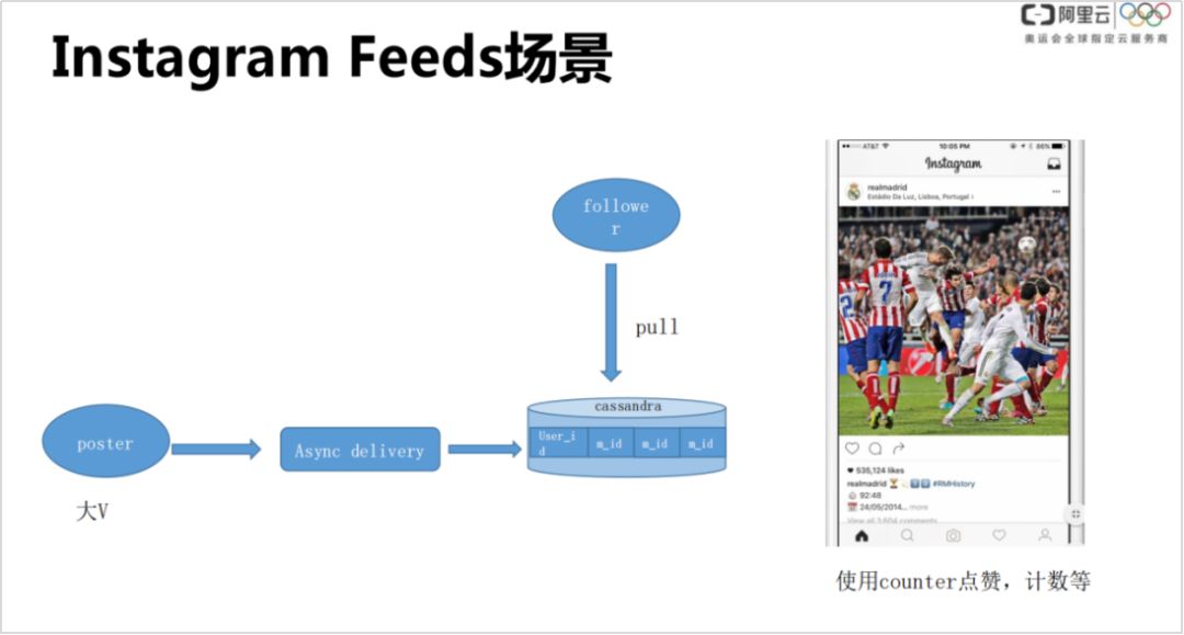Instagram 的 Feeds 应用场景,与微博类似,大 V 会发图片和动态,同时一般也有很多的粉丝。当大 V 发图片或者动态,首先会有一个异步的推送 ( delivery ),把大 V 发布内容推到数据库里,然后粉丝读取大 V 动态的时候,再去拉取数据库的对应信息。比如川普有几千万的粉丝,对于每个粉丝都会去更新消息的 id,然后把信息写进来。对于每个粉丝,通过自己 id 查到对应的消息 id,再关联别的表查一下就可以获取到大 V 的动态。