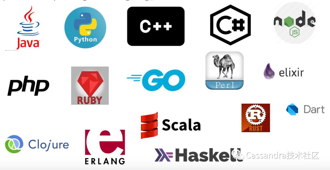 作为全球范围内最流行的宽表数据库,Apache Cassandra具备诸多优点:海量数据存储;简洁易上手的类SQL语法;总是在线;扩容灵活等。除了服务端的各种优点之外,Cassandra对各种语言客户端(driver)的高性能支持也是其实现易用性和良好性能的重要环节。Cassandra支持几乎所有流行语言的原生客户端:Java/Python/C++/C#/NodeJS/PHP/Ruby/Go/Perl/Scala...(详细列表参见Cassandra文档) 。下图列出了Cassandra支持的开发语言: