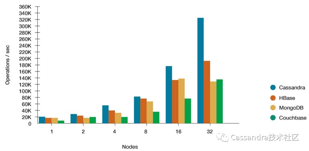 同时,Cassandra客户端良好的架构设计保证了在易于使用的同时能够从服务端获取最大的性能。下图是Cassandra和一些其他引擎的性能对比(出自https://www.datastax.com/nosql-databases/benchmarks-cassandra-vs-mongodb-vs-hbase)