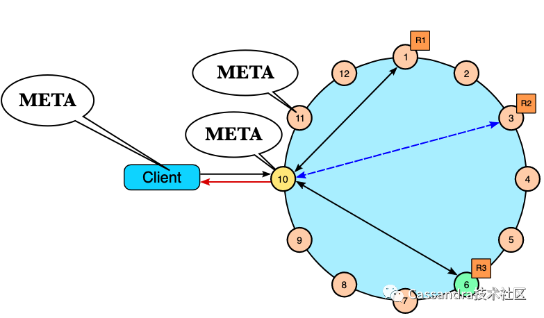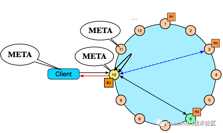 1.Cassandra在把客户端请求路由到数据节点时不需要从远端节点查找meta。2.Cassandra客户端的策略可以很灵活,既可以把任意一个节点作为proxy来发送请求,也可以像重客户端一样把请求发到数据所在的节点减少网络转发的请求,如下图: