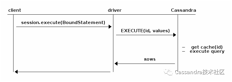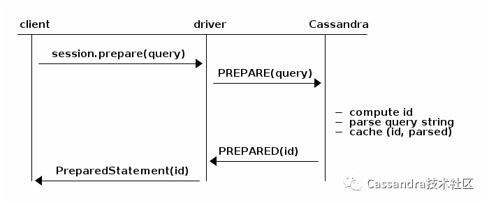 PreparedStatement的执行过程分为两个步骤,prepare阶段服务器会解析CQL语句并缓存: