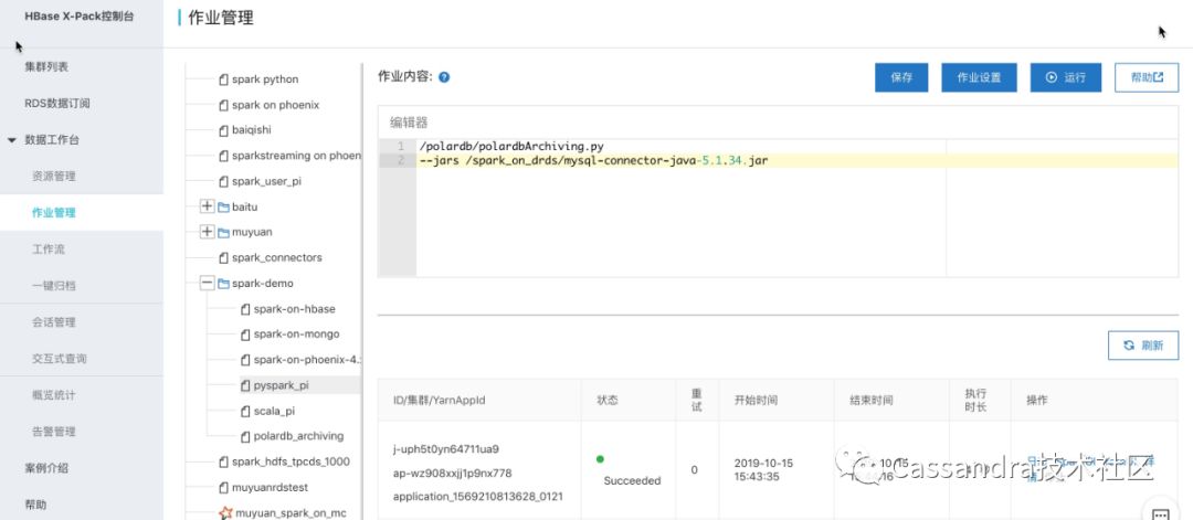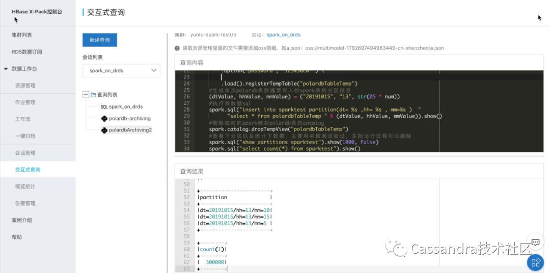 本文主要介绍如何把这些水平分表的表归档到X-Pack Spark数仓,做统一的大数据计算。X-Pack Spark服务通过外部计算资源的方式,为Redis、Cassandra、MongoDB、HBase、RDS存储服务提供复杂分析、流式处理及入库、机器学习的能力,从而更好的解决用户数据处理相关场景问题。具体产品见: