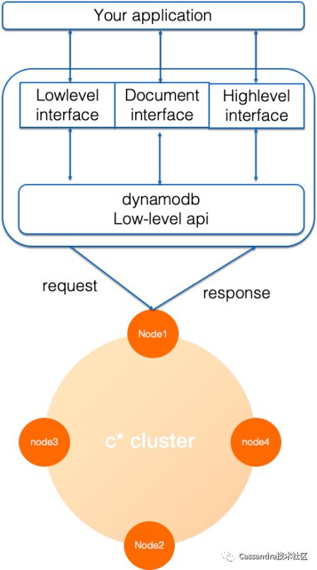 云cassandra内置了httpserver,实现了dynamodb全部协议。客户通过dynamodb sdk/CLI发送dynamodb请求至cassandra集群,云cassandra会解析这些请求,然后将这些读写请求转去操作底层存储引擎。我们完全可以把阿里云cassandra当成aws dynamodb来使用了。