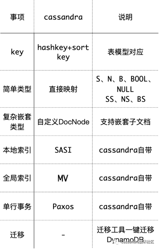 下图是与aws dynamodb重大特性兼容的一览表, 可以看到在dynamodb的核心能力,如表模型,数据模型,二级索引(LSI),全局索引(GSI)我们都做了很好支持,甚至有一键迁移功能能帮助客户把数据从aws dynamodb迁移到阿里云cassandra。