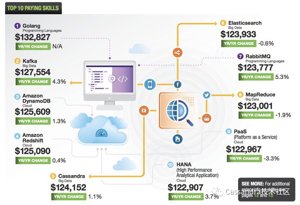 这么多的分享,背后必然有一个强大的生态社区,本文将梳理下Cassandra的商业公司、云公司、全球使用的大公司及相关生态的支持。另外有份资料表明,从事Cassandra职业的薪水非常可观,排名第五!