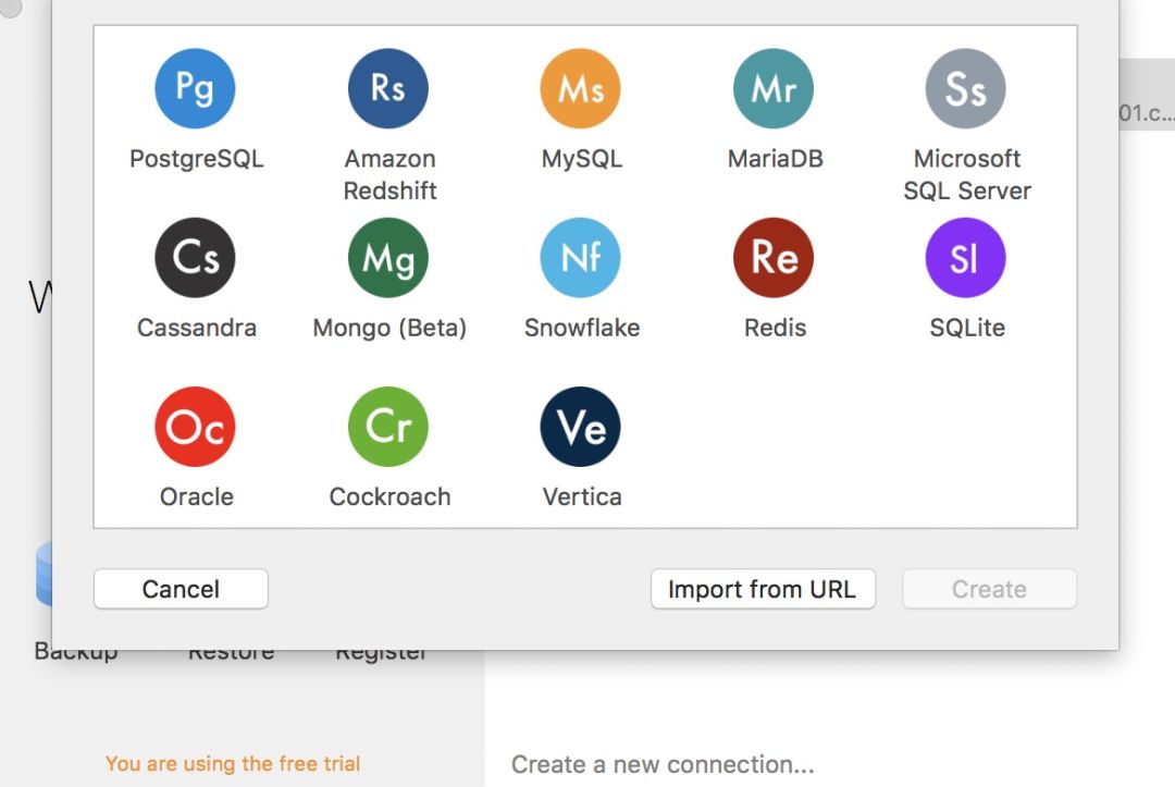 4、新建连接:create a new connection,发现支持了很多数据库,其中就包括Cassandra数据库。