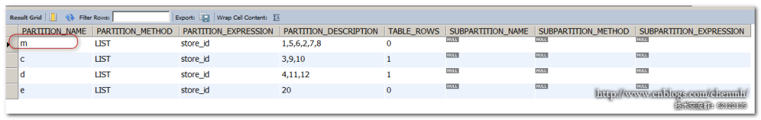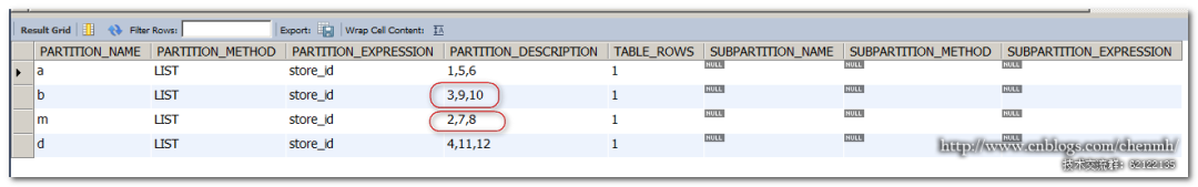 SELECT PARTITION_NAME,PARTITION_METHOD,PARTITION_EXPRESSION,PARTITION_DESCRIPTION,TABLE_ROWS,SUBPARTITION_NAME,SUBPARTITION_METHOD,SUBPARTITION_EXPRESSION