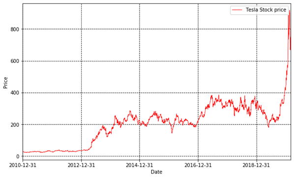 Finally, we need to visualize our data. The first important thing is to plot Tesla’s stock price: