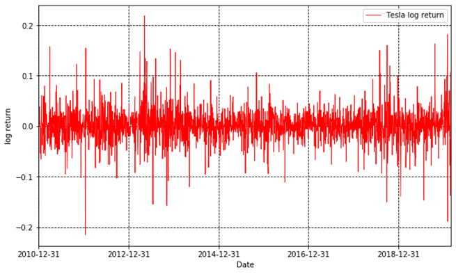 And time series models as well as other financial models (such as the black Scholes model) always have the assumption of normal distribution. Thus, we’d better include daily log returns in our TSLA dataset. This can be done using following codes:
