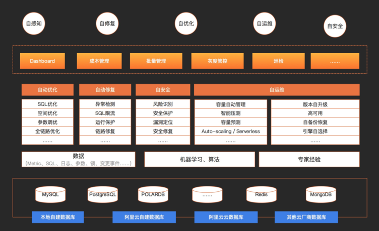 针对这个场景,阿里云数据库自治服务团队(DAS)推出了智能压测服务,致力于解决大促场景下计算资源评估问题、迁移上云的离线资源容量规划、跨引擎迁移等数据库选型评估问题。DAS(Database Autonomy Service)是一种基于机器学习和专家经验实现数据库自感知、自修复、自优化、自运维及自安全的云服务,帮助用户消除数据库管理的复杂性及人工操作引发的服务故障,有效保障数据库服务的稳定、安全及高效,解决方案架构见图1。