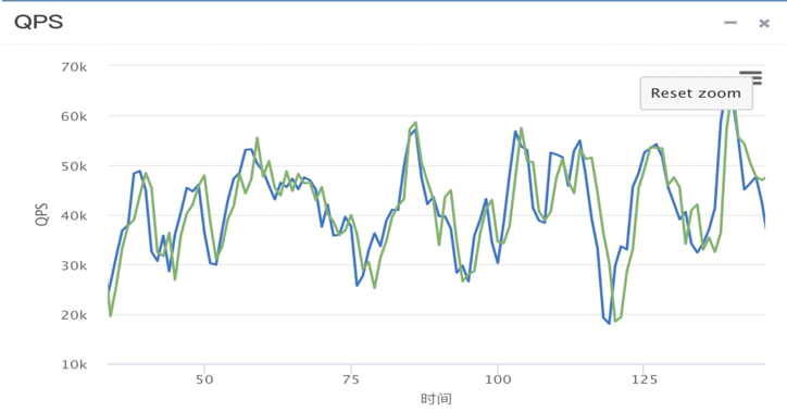 在数据准备完成之后,如何有效且可重复的进行流量回放是智能压测中的另一项核心技术。尽管业内已有的开源工具均可以通过并发大量数据库连接结合一定的查询语句来制造出一定的SQL流量,达到模拟业务高强度使用数据库的效果。但是,在使用了真实的且有一定数据倾斜的业务模型之后,会发现一个比较严重的问题:假如多次测试同一个模型同一份数据在RDS MySQL下的性能效果,在数据有倾斜的情况下,两边的性能曲线很可能对不上。例如,第一轮压测在A时间点查到了某一个数据,而第二次压测很可能在B时间点才查到,这样对分析问题就有了很大干扰,如图5所示,两条曲线虽然压力差不多,但是抖动频率完全不一致,不利于分析。