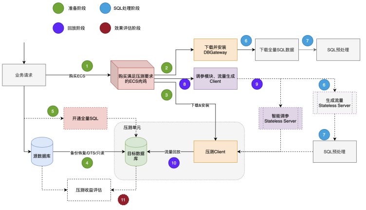 准备阶段主要是解决压测的机器环境问题,涉及从购买ECS机器、准备压测目标实例、配置ECS机器上的运行环境等。目前DAS的智能压测可根据压测流量的QPS和回放时长,自主选择合适的ECS机器并自动配置运行环境,也允许用户采用利用自有机器进行压测。在准备压测目标实例环节,现在DAS可通过RDS备份恢复、DTS同步的方式来自助帮助用户准备好目标实例,也允许用户自由指定压测实例。