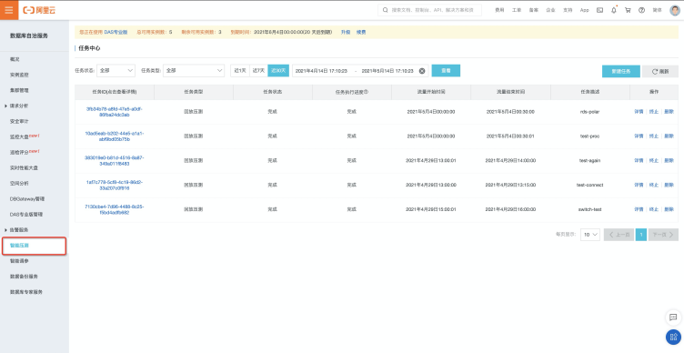 用户可以在DAS控制台的左侧菜单“智能压测”进行使用,如图8。目前DAS支持RDS MySQL和PolarDB MySQL压测,其他关系型数据库引擎的支持正在开发中。