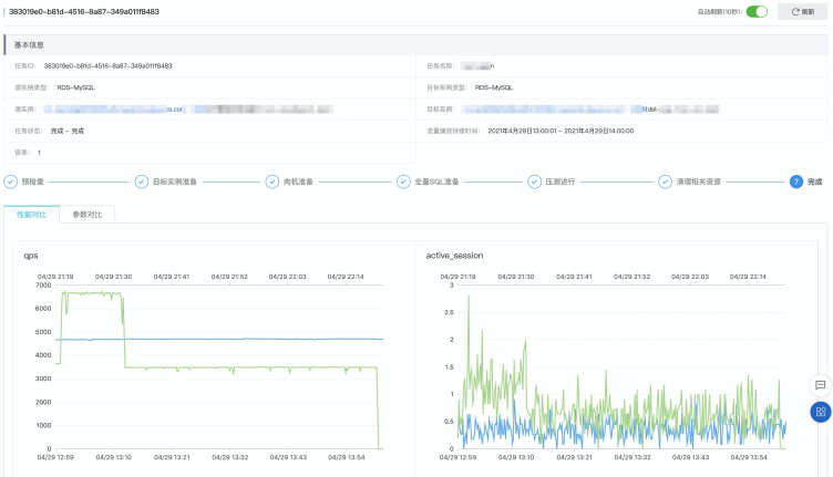 在压测结束之后,用户可以通过任务详情查看到目标实例与源实例的性能数据对比以及关键参数的对比,如图9所示。