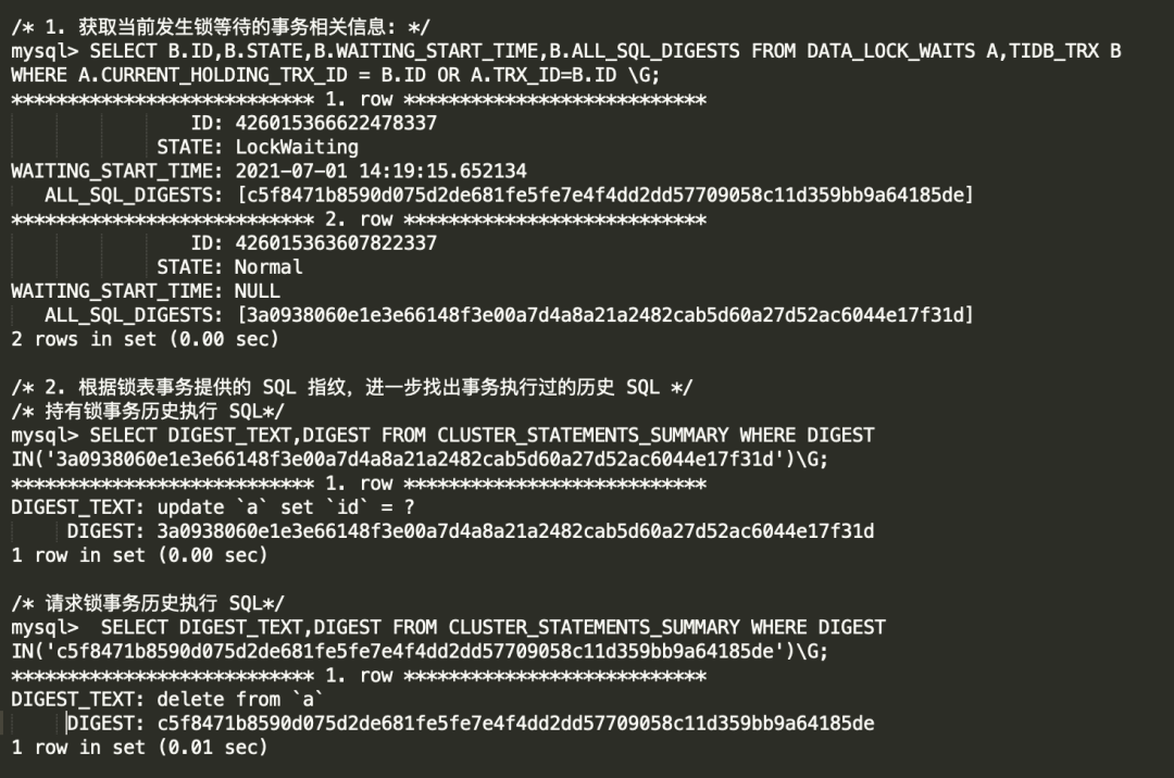 业务开发需要很谨慎地处理数据库并发事务,一旦发生锁表会给线上业务带来巨大影响,而 DBA 需要快速定位锁表原因以保证业务能够恢复正常。TiDB 5.1 中新增 Lock View 系统表视图,可以快速定位到引起锁表的事务和相关 SQL 语句,从而提高锁冲突问题的处理效率。下面一个小例子展示如何使用 Lock View 快速定位发生锁表的事务和 SQL 语句。