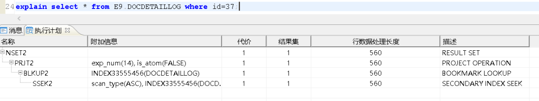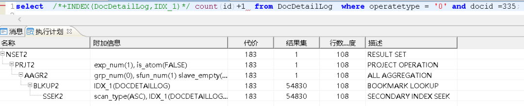 我们这里可以强制使用该索引,查看执行计划,可以看到使用索引的话,在查询ID列时,需要进行表的二次扫描,这样的代价比不使用索引更大: