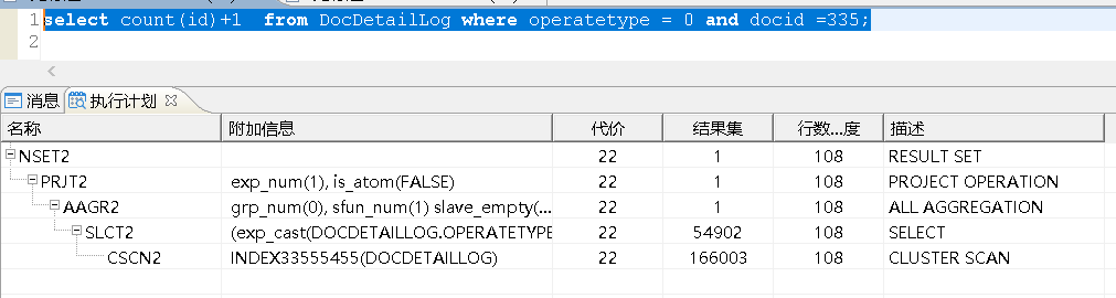select count(id)+1 from DocDetailLog where operatetype = 0 and docid =335;--81396select count(*) from DocDetailLog where operatetype = 0;--111823select count(*) from DocDetailLog where docid =335;--81396