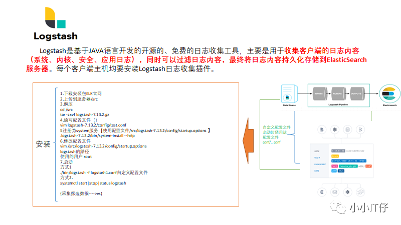 1.下载安装包ELK官网2.上传到服务器/src3.解压cd srctar -zxvf logstash-7.13.2.gz4.编写配置文件()vim logstash-7.13.2/config/test.conf5注册为system服务【使用配置文件/src/logstash-7.13.2/config/startup.options 】.logstash-7.13.2/bin/system-install --help6.修改配置文件vim src/logstash-7.13.2/config/startup.optionslogstash的路径使用的用户 root7.启动方式1./bin/logstash -f logstash1.conf自定义配置文件方式2.systemctl start|stop|status logstash{采集筛选数据---->es}