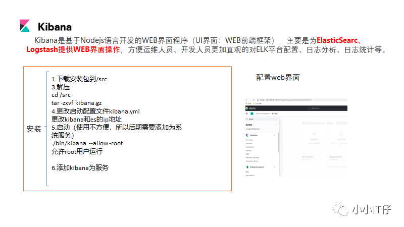 1.下载安装包到/src3.解压cd srctar -zxvf kibana.gz4.更改启动配置文件kibana.yml更改kibana和es的ip地址5.启动(使用不方便,所以后期需要添加为系统服务)./bin/kibana --allow -root允许root用户运行6.添加kibana为服务vim lib/systemd/system/kibana.service[Unit]Description=Git Auto Update Hook ServiceAfter=network.target[Service]Type=simpleExecStart=/src/kibana-7.13.2-linux-x86_64/bin/kibana --allow-root -c src/kibana-7.13.2-linux-x86_64/config/kibana.ymlRestart=always[Install]WantedBy=multi-user.targetsystemctl strat kibana____________________________________________________________________{es---->kibana}7.设置中文语言中文包在 usr/share/kibana/node_modules/x-pack/plugins/translations/translations/zh-CN.jso只需要在配置文件 kibana.yml 中加入i18n.locale: "zh-CN"