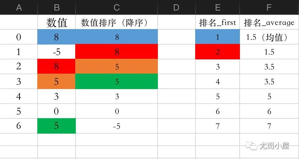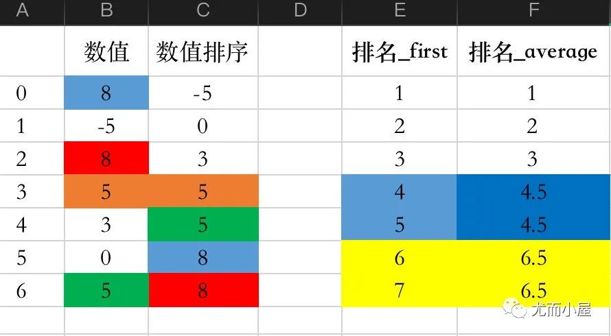 通过average的使用,相同数值的排名rank会取出均值,5的排名统一成4.5,8的排名统一成6.5