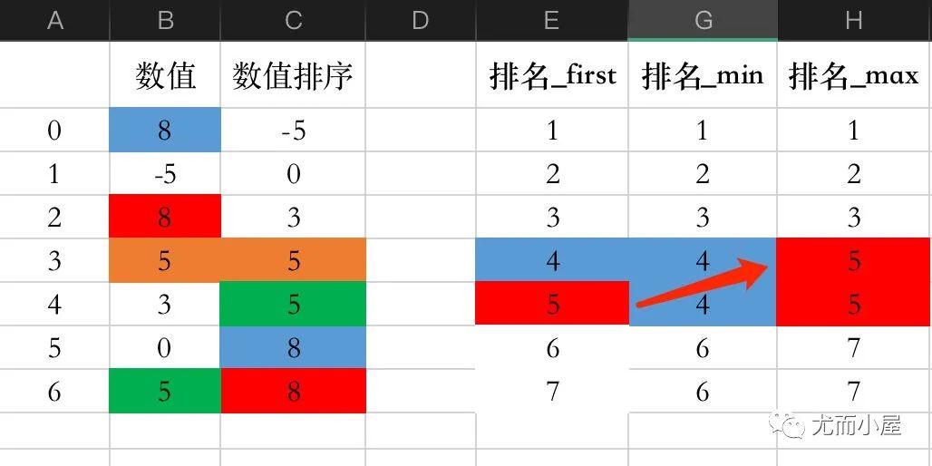 比如当:method= "max":如果数值相同,取该数值最大的那个排名。比如5最大的排名是5,所以原始数据中两个5的排名都是5;两个8的排名都是7(8的两个排名是6和7,取大值7)
