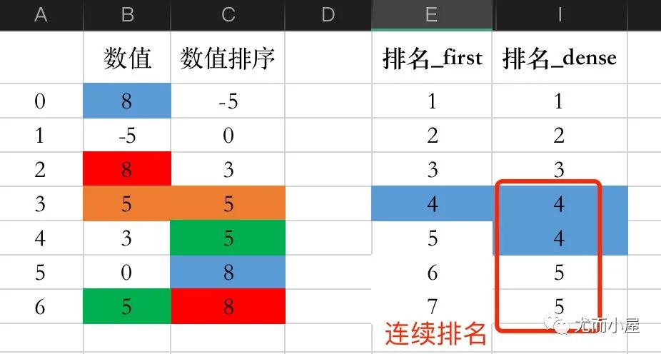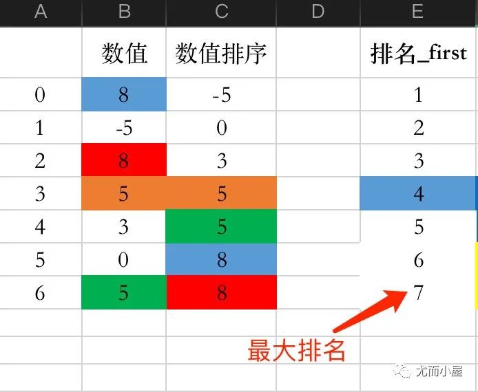 根据值在原始数据中出现的顺序进行排名,相同数值的排名依次加1: