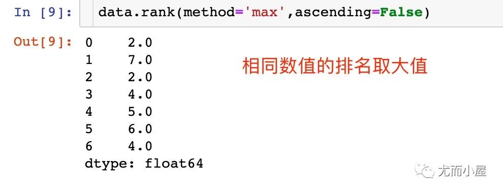 数值中8的排名,如果是method=“first”,排名是1和2,如是使用average,排名则会变成1.5;其他的数值排名类似。再看看max的情况: