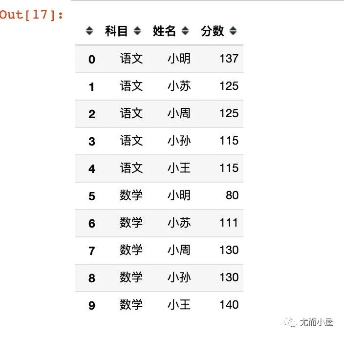df0 = pd.DataFrame({"科目":["语文","语文","语文","语文","语文","数学","数学","数学","数学","数学"],