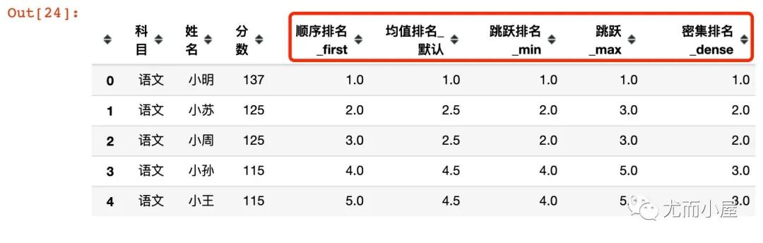 df1["跳跃排名_min"] = df1["分数"].rank(method="min",ascending=False)