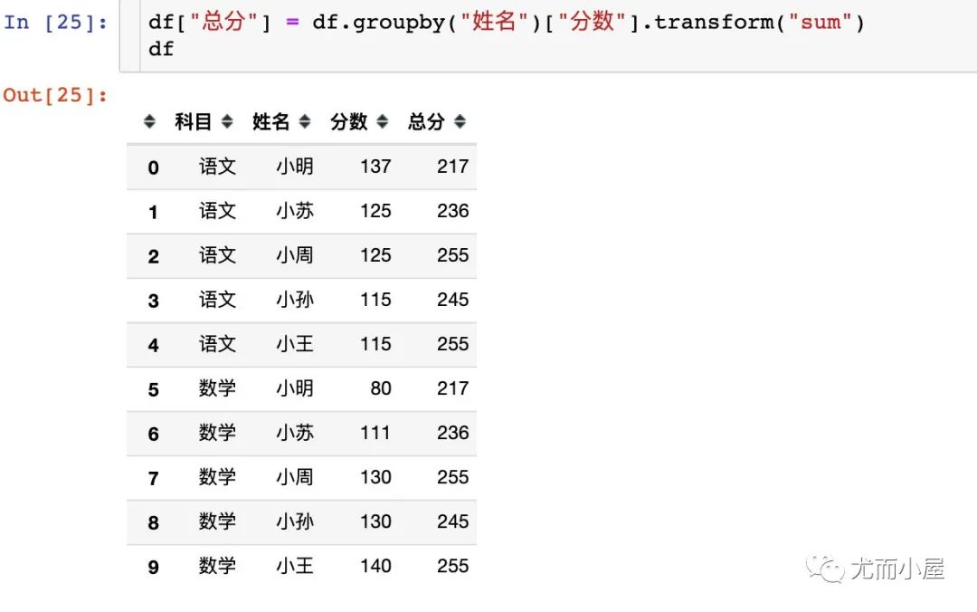 df["总分"] = df.groupby("姓名")["分数"].transform("sum")