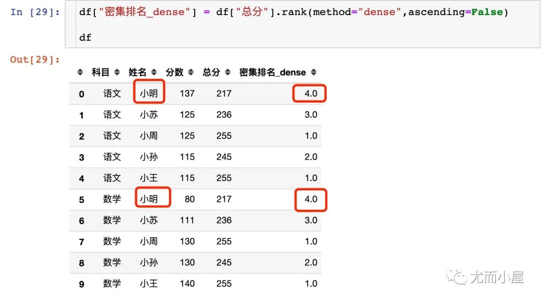 df1["密集排名_dense"] = df1["分数"].rank(method="dense",ascending=False)