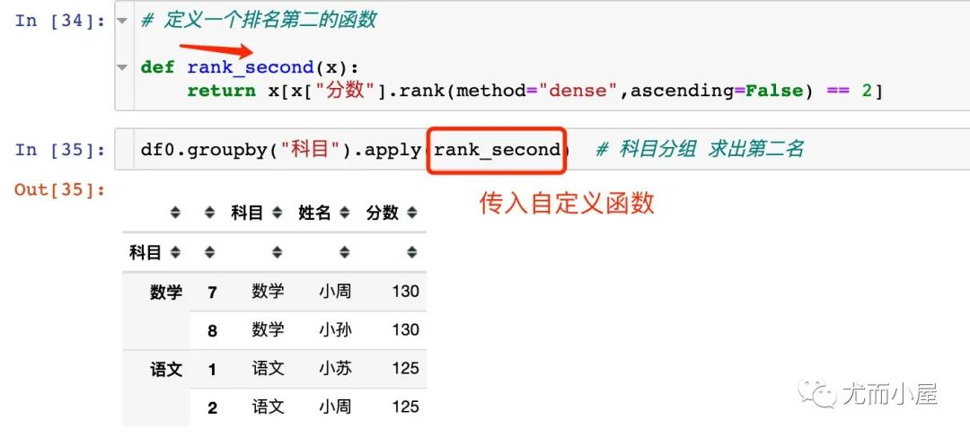 当我们使用这个自定义函数的时候,我们需要先根据科目进行分组,然后再每个组中单独使用这个自定义函数,就能获得每个科目下的第二名。