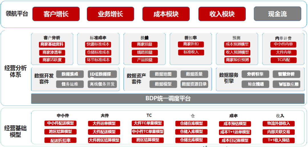 每个公司的业务数据和财务数据是天然割裂的状态。举例来说,一家全国规模的连锁店,每个店的店员的薪资和日程运营的费用(如水电费)怎么来反映到每一单上面去,如何把业务数据和财务数据打通,这有点像银行的分润,把业务数据规范到每一个环节对应的每个功能点上去,即成本因素和收支因素的影响点,再把数据再给分担上去。这也就是基础模型搭建的一个过程,最终会支撑到上游资金分析体系的客户的分析和成本支持。