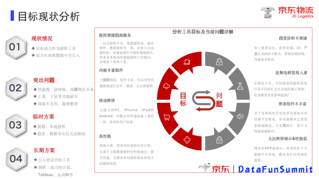 目前京东物流数据探索领域分析工具的目标以及当前目标现状的分析,包括:
