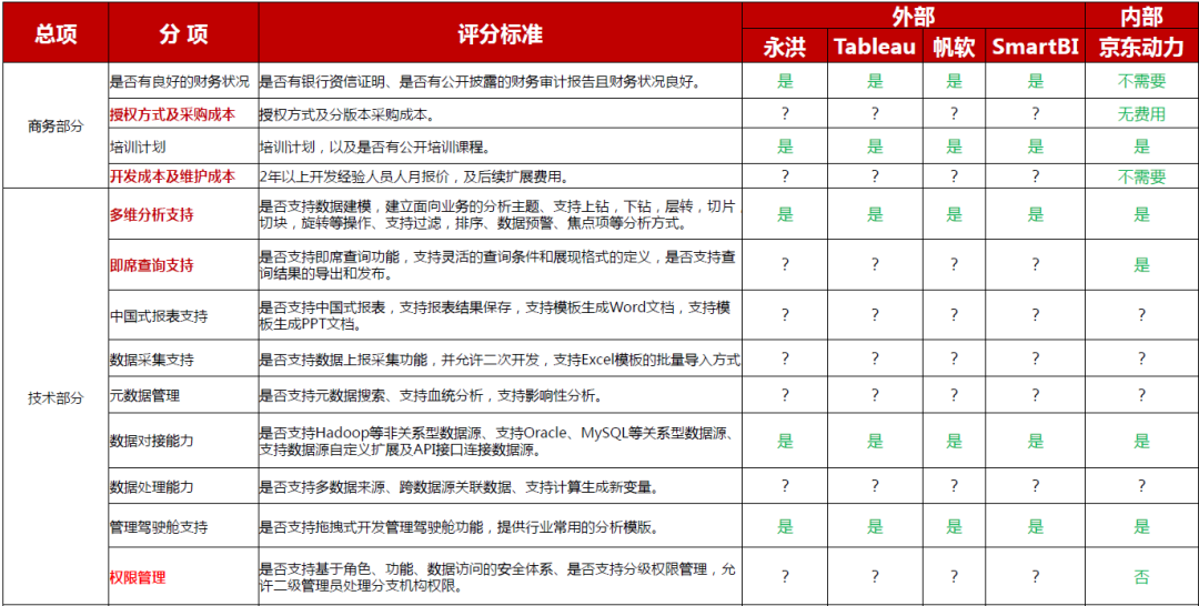 外部工具调研,从成本,市场成熟度,产品易用性,扩展性,性能等多维度交叉比对市场主流BI工具的优缺点;