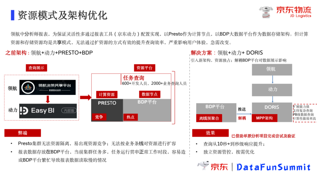 领航中分析师报表,为保证灵活性多通过报表工具(京东动力)配置实现,以Presto作为计算节点,以BDP大数据平台作为数据存储架构。但计算资源和存储资源均是共享模式,无法通过扩资源的方式有效的提升查询效率,严重影响用户体验,急需改变。