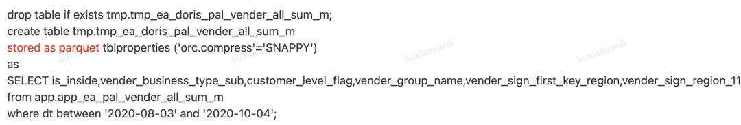 -d 表示对doris数据库的表进行操作【默认参数是:db_null 不执行建表】db_get_crt:表示打印出doris建表语句,该逻辑会读取hive中的表结构,然后将HIVE中的字段为string类型的当成维,int,bigint,double类型的当成值生成建表语句【具体逻辑请参考脚本】