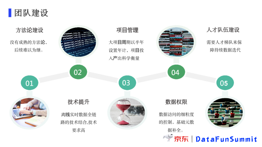 独木不成林,任何一个项目的成功都是团队配合的结果。在团队建设之初,团队的人员相对较少,对接的业务也相对聚焦,从0到1的数据建设过程中一定是采用“纵向”的开发方式——一个数据开发对接一个条线,对当前条线从头到全盘负责,实现高速迭代。这个阶段会形成团队核心价值,当各业务方都认可这种数据分析思路,随之而来的就是业务需求膨胀,不同主题之间的横向拉通分析,组内人员的补充等。如何做到人员价值最大化,则需要投入精力在团队建设上,主要包括: