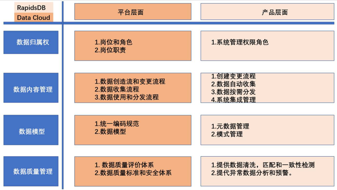 Data Cloud建设技术选型非常重要,既要发挥原先数据系统的优势,又要联邦各类数据源去做有目标的事,如果产品不满足要求,dataCloud要额外做开发,下面dataCloud的数据服务的需求功能以及RapidsDB本身提供的功能。