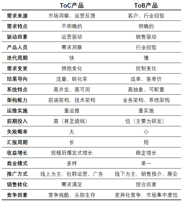 做To C产品,有爆发性增长的机会。在To B里面是不可能。To B都是线性增长的。原因也很简单:首先,从企业真实需求获取,To B就要长一些,那自然研发速度也就跟着慢下来;到了采购阶段,To B用户决策流程也会偏长,导致获客周期就会比较长;通常客单价越高的产品,客户决策周期越长;到了交付产品的时候,To B还有一个实施周期的问题。所以To B的创业节奏相对于To C一定会慢很多。因此做To C的人转行去做To B,心态千万不能崩,不能急于求成。